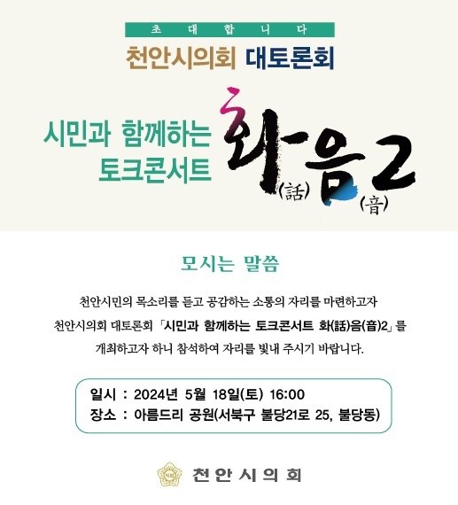정도희 천안시의회 의장은 "천안시민들을 직접 만나 의견을 나눌 수 있는 자리를 마련하였던 작년의 토크콘서트 ‘화음’의 취지가 이어지기를 바라는 마음에 이번 행사를 준비했다"며 “시민들께서 많이 참석해 주시어 지역 발전을 위한 생생하고 생산적인 이야기를 해주시길 바란다”고 말했다.