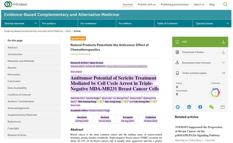[세계타임즈=우경원 기자] 헬스케어 전문기업 ㈜조윈이 지난해 발표한 논문 ‘견운모의 암 치료 기전 연구’가 견운모의 삼중 음성유방암 세포의 성장 억제 효과성을 입증하며, 세계적인 국제학술지 ‘힌다위(Hindawi)에 등재되는 쾌거를 거두었다.