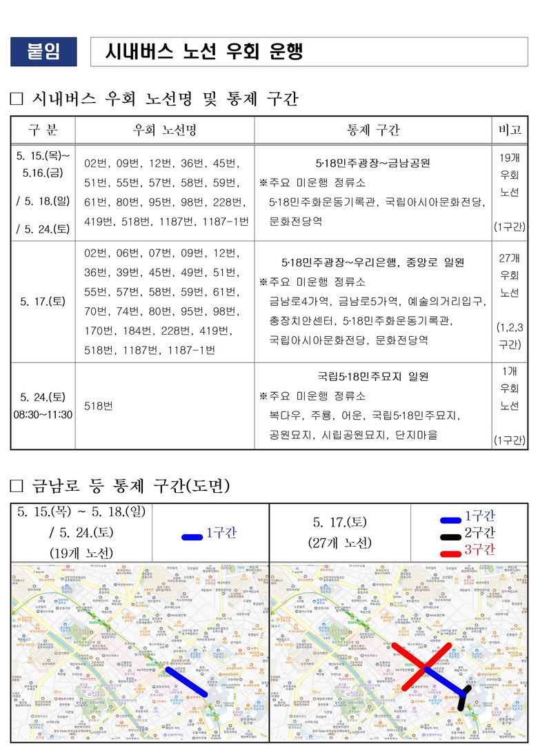 24일 국립5·18민주묘지 일원에서는 5·18마라톤대회가 열림에 따라 518번 버스는 오전 중 우회 운행할 예정이다.
