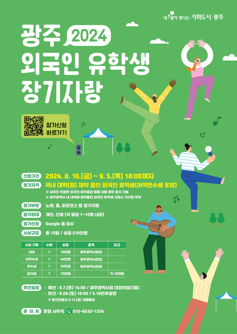 - 외국인 유학생들, 끼‧재능으로 소통‧화합…‘문화‧포용 광주’ 만끽 [광주 세계타임즈=손권일 기자] 광주광역시(시장 강기정)는 오는 9월 5일까지 ‘2024 광주 외국인 유학생 장기자랑 대회’ 참가자를 모집한다.