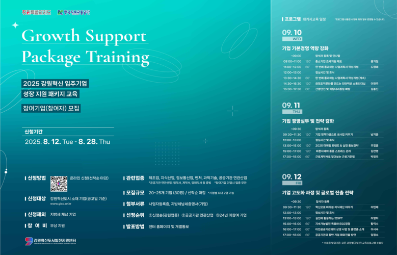 신청서 접수기간은 8월 12일부터 8월 28일까지이며, 20 ~ 25개 기업 30명을 선착순 모집하여 9월 10일부터 9월 12일까지 3일간 무료로 진행된다.