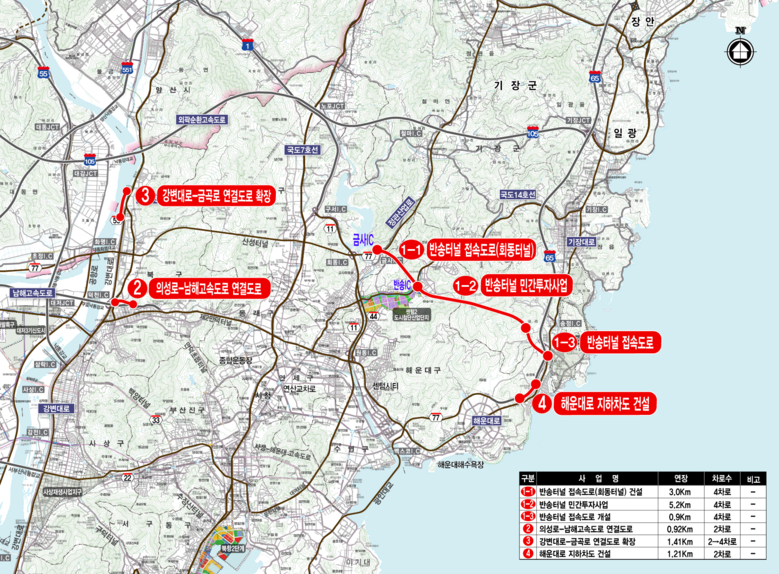 ◈ 최우선 사업인 반송터널을 비롯해 ▲의성로~남해고속도로 연결도로 ▲강변대로~금곡로 연결도로 확장 ▲해운대로 지하차도 건설