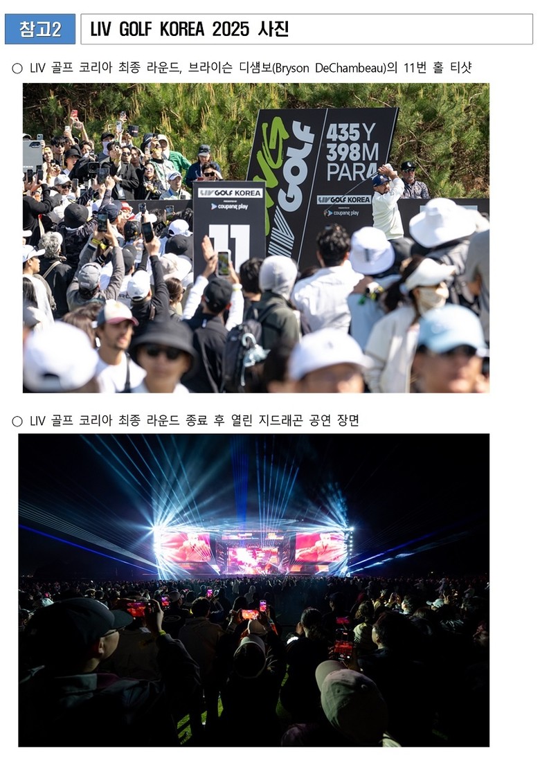 국내에서도 2025 리브 골프 코리아(LIV Golf Korea)에 지드래곤(G-DRAGON), 아이브(IVE), 다이나믹듀오, 거미 등 정상급 아티스트가 참여하며 골프 팬뿐 아니라 일반 관람객까지 유입시키는 데 성과를 거둔 바 있다.