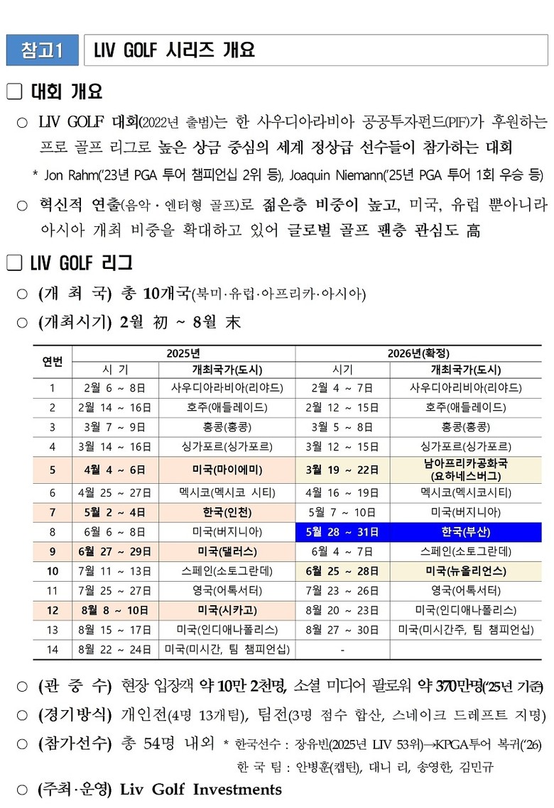 지난해 국내에서 처음 시작된 리브 골프 코리아(LIV Golf Korea)는 인천 잭 니클라우스 골프클럽에서 열렸으며, 이후 협의 과정을 거쳐 ‘2026 리브 골프 코리아’의 부산 개최가 확정됐다.