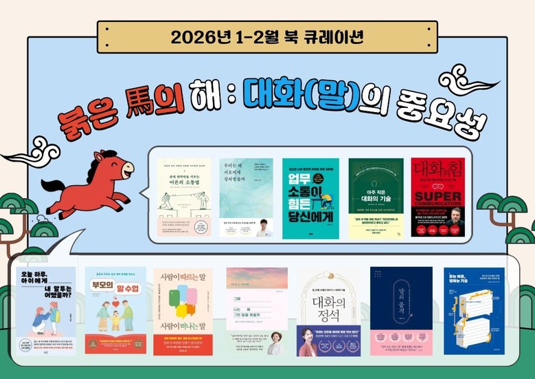 그 첫 번째 문을 여는 1~2월의 주제는 ‘붉은 말(馬)의 해, 대화(말)의 중요성’이며, 말과 관련된 상징과 소통의 가치를 담은 도서 12권을 엄선해 추천한다.