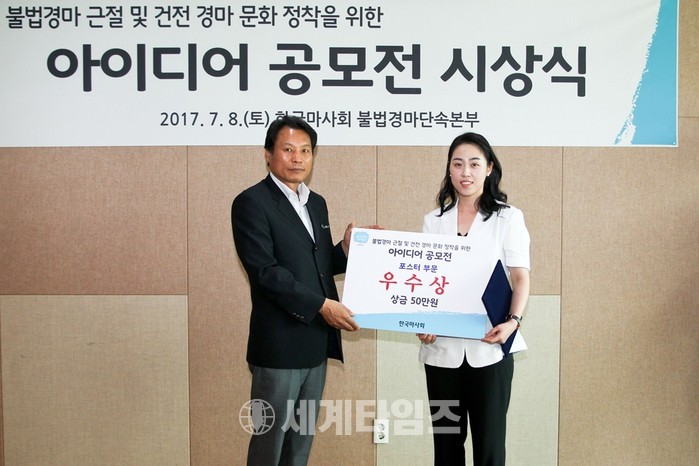 [세계타임즈 임인규기자]한국마사회 는 지난 7월 8일(토) 렛츠런파크 서울에서 불법경마 근절 아이디어 공모전 시상식을 가졌다. 한국마사회 박양태 경마본부장(불법경마단속본부장 겸)과 수상자 등 15여명이 참석했으며 시상식, 기념촬영 등의 순으로 진행됐다.