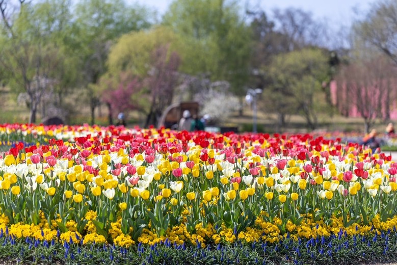 따사로운 봄 햇살 아래 형형색색의 튤립이 만개해 정원을 화사하게 물들이고 있다.
