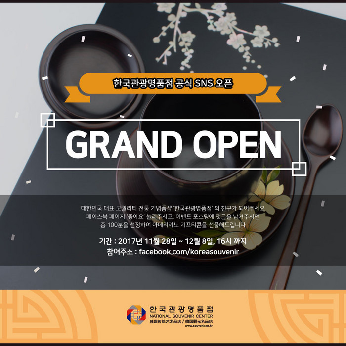 한국관광명품점 공식 SNS 오픈을 기념하기 위해 11월 28일부터 12월 8일까지 약 2주간 페이스북 이벤트가 진행된다. 한국관광명품점 페이지 ‘좋아요’를 누르고 축하 댓글을 남기면 참가할 수 있으며, 추첨을 통해 총 100명을 선정해 커피 교환권을 증정한다.