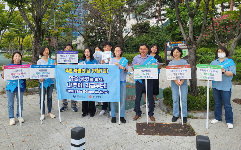 [광주 세계타임즈=손권일 기자] 광주광역시(시장 강기정)는 영산강유역환경청, 광주환경운동연합과 함께 ‘푸른 하늘의 날(9월7일)’을 맞아 3일 서구 치평동 KBS 사거리 일원에서 ‘대기환경 개선 홍보 캠페인’을 벌였다.