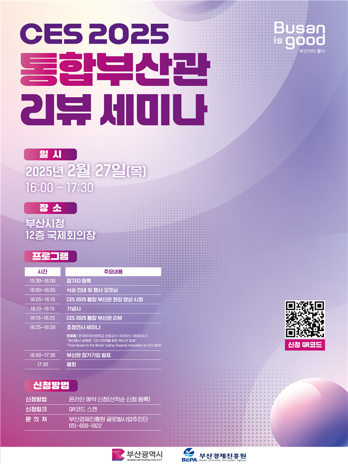이날 행사는 ▲스케치 영상 상영 ▲「CES 2025」 추진사항 보고 ▲'부산에서 세계로: 「CES 2026」을 향한 혁신의 항해' 주제의 전문가 강연 ▲통합 부산관 참가기업의 사례발표순으로 진행된다.