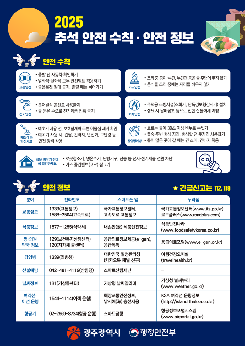 광주시는 추석 전까지 분야별 안전점검을 마치고, 연휴가 끝나는 10월 9일까지 광주시 누리집, 전광판, 사회관계망서비스(SNS) 등을 통해 시민들에게 안전수칙과 생활정보를 안내한다.