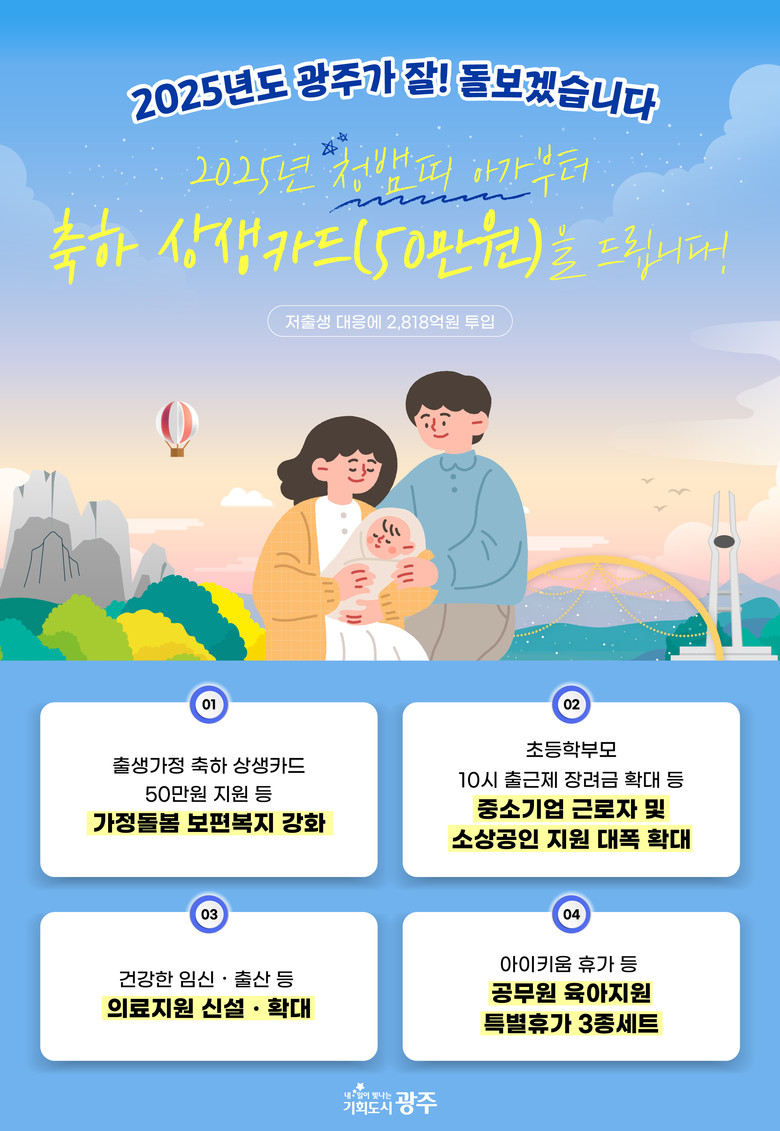 가정돌봄 강화를 위해 2025년 출생아부터 광주시에 출생신고를 한 출생가정에 1인당 50만원의 ‘출생가정 축하 상생카드’ 지원을 사회보장 협의를 거쳐 시행할 계획이다. 이는 생애 초기 양육에 따른 경제적 부담을 줄이고 소상공인과 지역경제 활성화에 도움을 주기 위한 것이다.