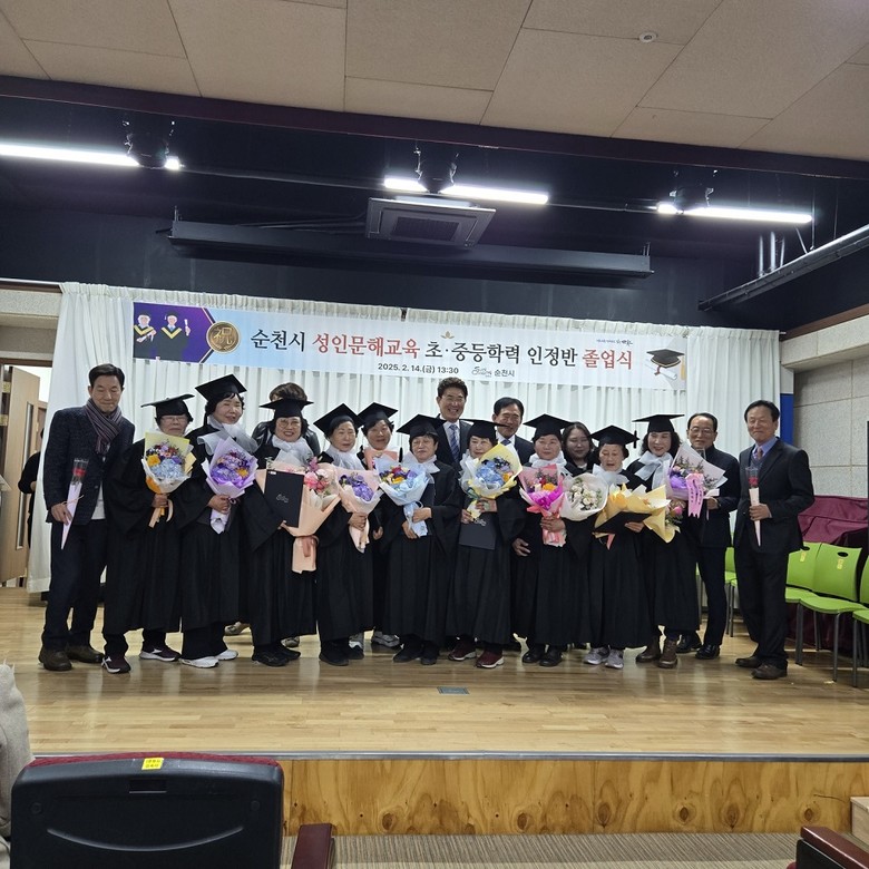 ▲ 성인문해교육 초중등 학력인정반 졸업식에서 졸업생들이 단체 기념사진을 촬영하고 있다