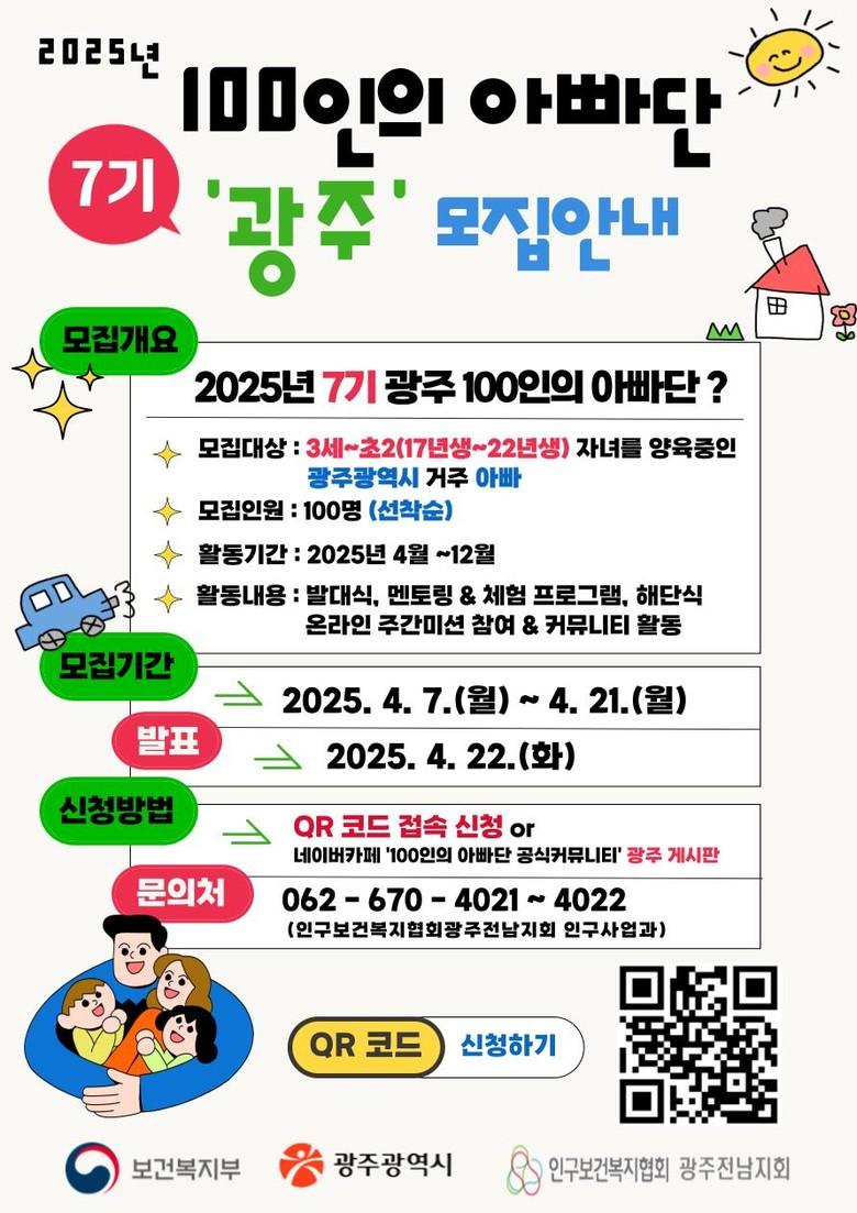 광주시가 보건복지부·인구보건복지협회 광주전남지회와 함께 모집하는 ‘100인의 아빠단’은 생애 첫 육아를 하거나 육아에 관심이 있는 초보 아빠들이 모여 육아고민과 노하우를 나누는 아빠모임으로, 지난 2019년 시작해 올해로 7기를 맞고 있다.