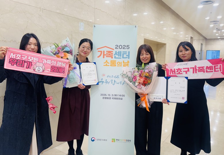 [서초구 세계타임즈=이장성 기자] 서울 서초구(구청장 전성수)는 서초구가족센터가 전국 244개 가족센터가 참여한 ‘2025년 가족센터 소통의 날’ 행사에서 가족상담 우수사업 부문 ‘최우수상’, 가족서비스 우수 프로그램 부문 ‘장려상’을 각각 수상했다고 밝혔다.