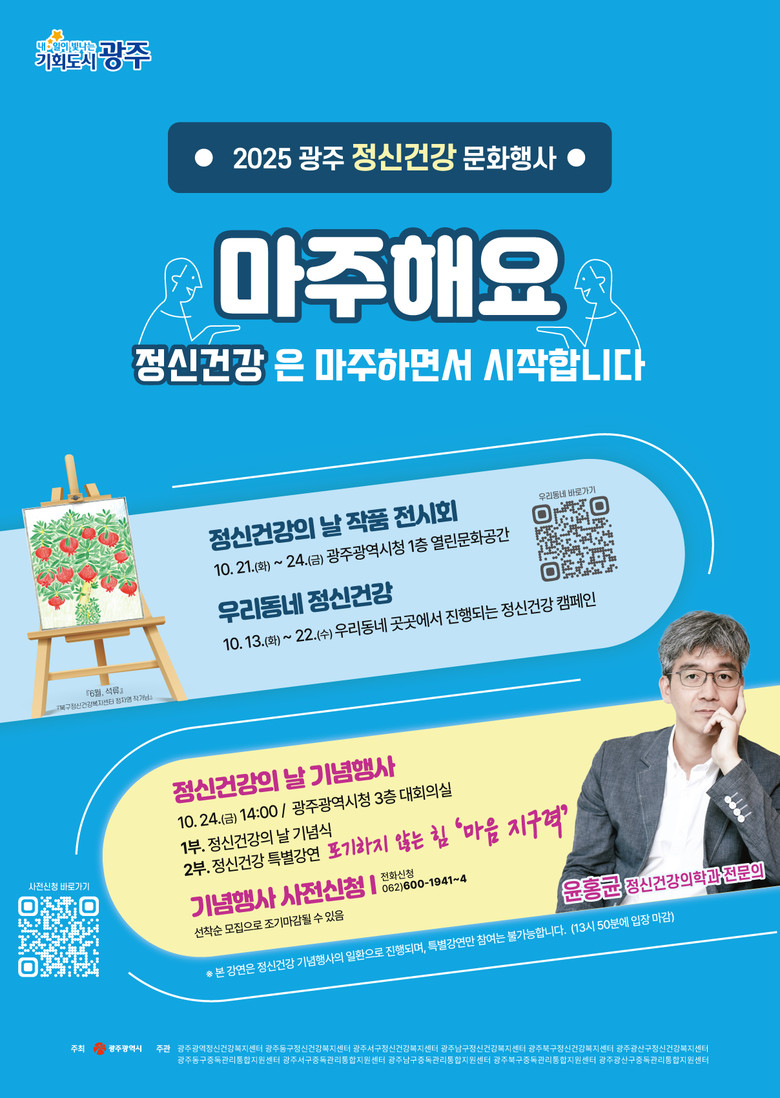 시민 누구나 무료로 참여할 수 있으며, 광주 정신건강 문화행사 누리집(https://gmhc.quv.kr) 또는 전화(062-600-1943)를 통해 사전 신청하거나 현장에서도 신청할 수 있다.