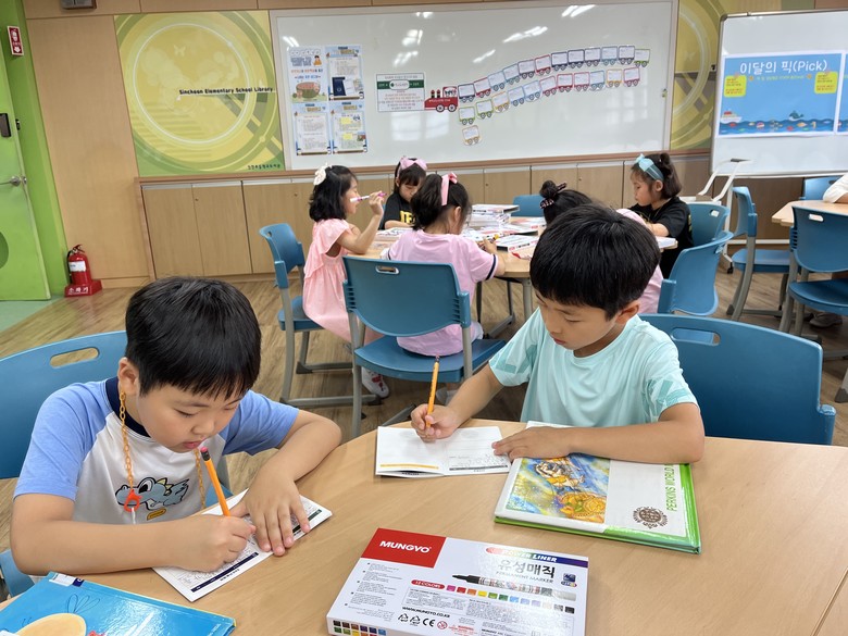 또한, 1~3학년 학생들은『꽁꽁꽁 아이스크림』독후 활동, 4~6학년 학생들은『5번 레인』주제 도서 생각 확장의 독후 활동 시간을 가졌다. 아울러 전교생이 명작 동화와 여름 주제 도서를 재미있게 읽을 수 있도록 권장하는 ‘칙칙폭폭 우리들의 명작 기차’ 활동과 이 달의 주제 <푸른 바다 도서> 북큐레이션을 활용하여 여름 관련 ‘캐릭터 투명 부채’를 만들어보는 활동도 진행하였다.