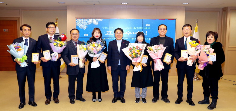 [광주 세계타임즈=손권일 기자] 강기정 광주광역시장이 19일 오전 시청 비즈니스룸에서 열린 ‘주민자치 및 마을공동체 활성화 유공 포상 수여식’에서 유공자들에게 포상한 뒤 기념촬영을 하고 있다. / 광주광역시 제공