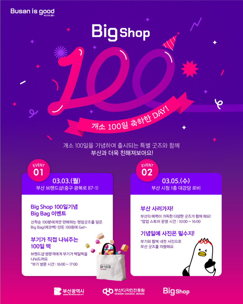 또한, 오는 3월 5일 오전 10시부터 오후 4시까지 'Big Shop(부산 브랜드숍) 100일 장터'를 시청 대강당 로비 앞에서 진행한다. 부산 도시브랜드 파트너스 20개 사와 협업·제작한 대표적인 팬 상품(굿즈)을 전시하고, 판매 공간(부스)과 부산 팬 상품(굿즈) 포토존을 운영할 예정이다.