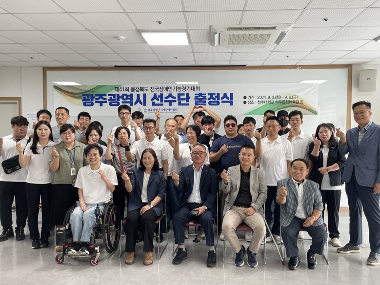 광주시청에서 열린 출정식에는 박종필 광주지체장애인협회장과 각 자치구 지회장 등이 참석해 광주시 선수들과 함께 대회 선전을 다짐했다.