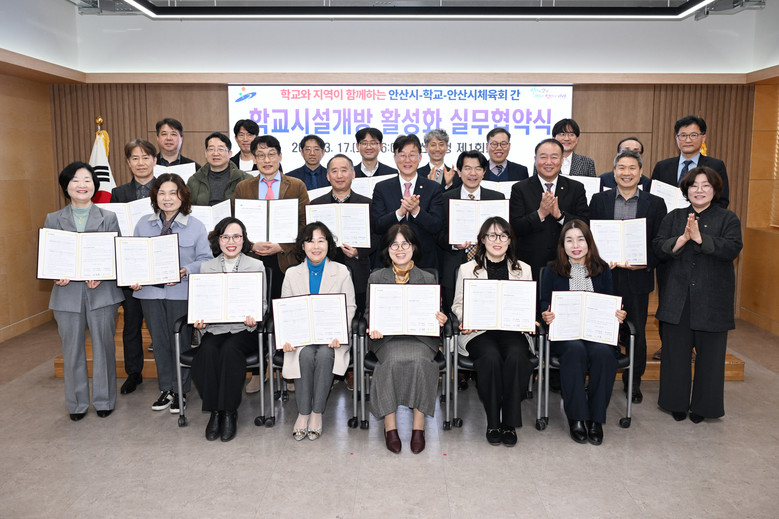 | ▲ 이민근 안산시장(둘째 줄 오른쪽 다섯번째)이 2026년 3월 17일 안산시청에서 _2026년 상반기 학교시설개방 활성화 실무협약식_을 진행하고 기념촬영을 하고 있다. |