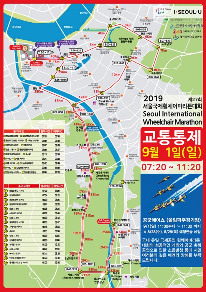 제27회 서울국제휠체어마라톤대회가 9.1(일) 오전 7시40분부터 잠실종합운동장~성남 일원에서 개최된다.