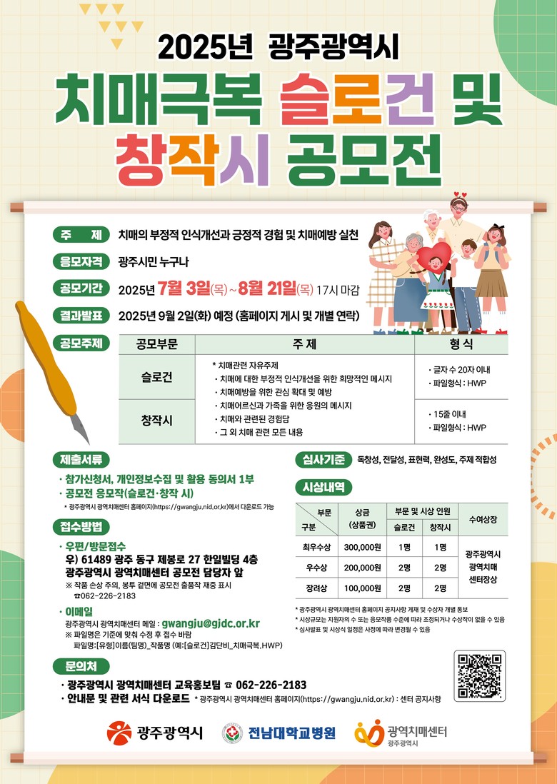 공모 결과는 오는 9월2일 광주시치매센터 홈페이지를 통해 발표된다. 시상은 9월18일 ‘치매극복의 날 기념행사’에서 진행된다.