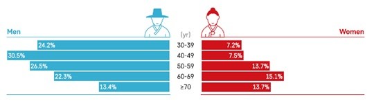 한국지질동맥경화학회의 보고에 의하면 이상지질혈증은 우리나라 30세 이상 성인 남자의 2명 중 1명, 여자의 3명 중 1명으로 매우 흔하다. 특히 중성지방이 높은 고중성지방혈증은 술이나 기름진 음식 섭취와 관련이 있어 30~40대 남자 3명 중 1명이 해당할 정도로 흔하며 같은 연령대의 여자보다 남자가 4배 이상 많다.