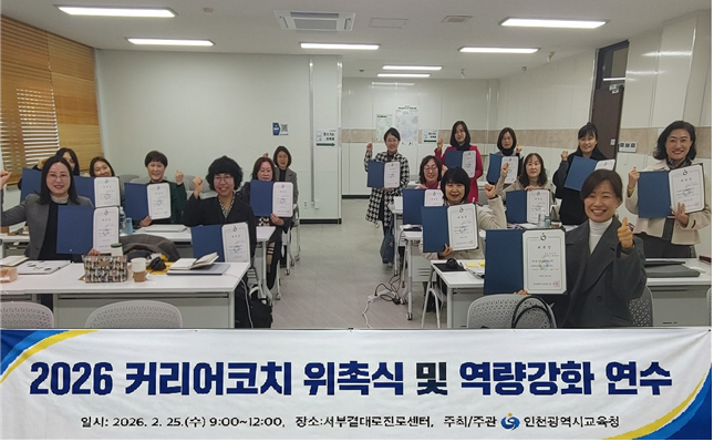 [인천 세계타임즈=심하린 기자] 인천광역시교육청(교육감 도성훈)은 25일 서부결대로진로센터에서 진로교육 전문가인 ‘커리어코치’ 20명을 위촉하고, 현장 전문성 강화를 위한 역량 강화 연수를 실시했다.