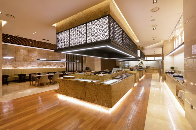 이번에 새롭게 단장된 뷔페 공간은 고객들에게 한층 고급스러운 분위기를 선사한다. 입구에는 포토존이 마련되었으며, 내부는 파티션으로 나뉜 소파석과 고급스러운 조명으로 우아한 분위기를 연출했다.