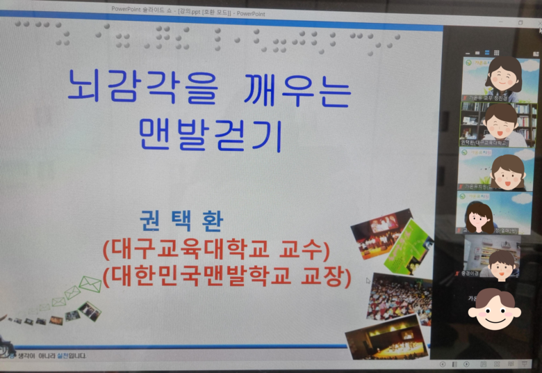 가온 교육공동체(유아, 학부모, 교직원)에서는 5월 10일 완공된 맨발길의 이름을 공모하여 투표를 통해 ‘가온누리길’이라고 정하였다. 그리고 5월 17일 대구교육대학교 권택환 교수의 ‘맨발걷기의 효과(뇌 발달, 면역력 증진, 활성산소의 감소 등)와 실천’에 대한 연수를 진행하였다. 이후 유아와 교직원은 맨발걷기 코스와 완주를 인증해 보며 실천 기록을 사진으로 남기고 이번 전시회에 참여하였다.