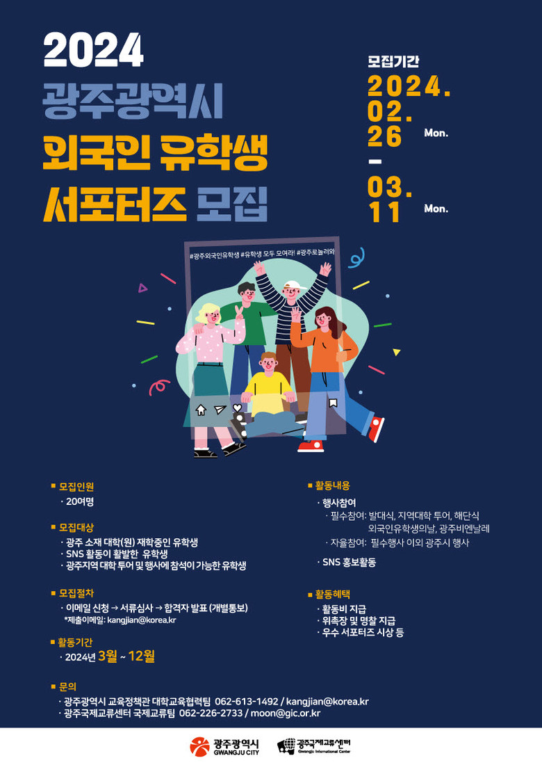신청을 희망하는 유학생은 광주시 누리집 고시·공고에 게시된 공고문을 참고해 신청서를 내려받아 작성 후 이메일로 제출하면 된다. 신청 접수는 3월 11일 오후 6시까지이다.