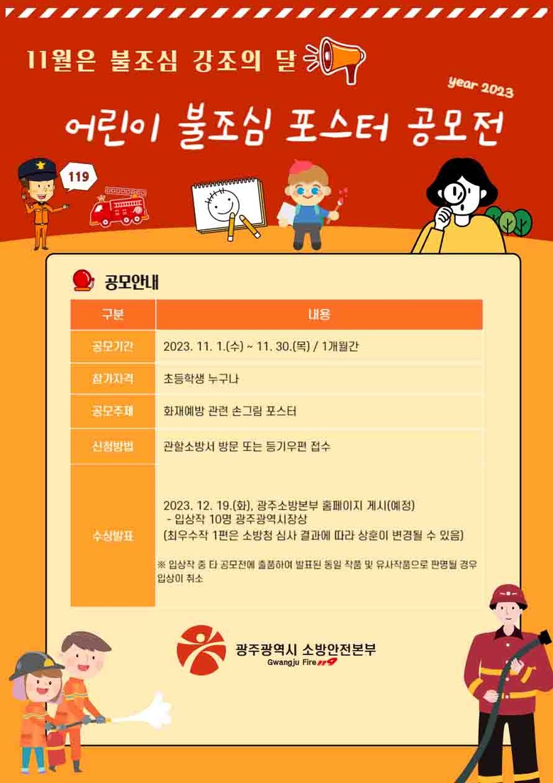 초등학생 누구나 화재예방을 주제로 그림을 그리는 ‘어린이 불조심 포스터 공모전’도 개최한다. 공모 결과 우수작품 10점을 선정하고, 최우수작으로 선정된 1개 작품은 소방청 주관 전국 심사에 광주 대표로 출품한다.
