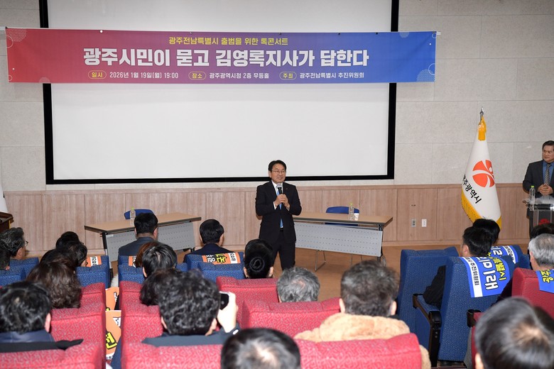 [광주 세계타임즈=손권일 기자] 강기정 광주광역시장이 19일 시청 무등홀에서 열린 '(가칭)광주전남특별시 출범을 위한 톡 콘서트'에 참석해 참석자들과 함께 퍼포먼스를 하고 있다. /광주광역시 제공