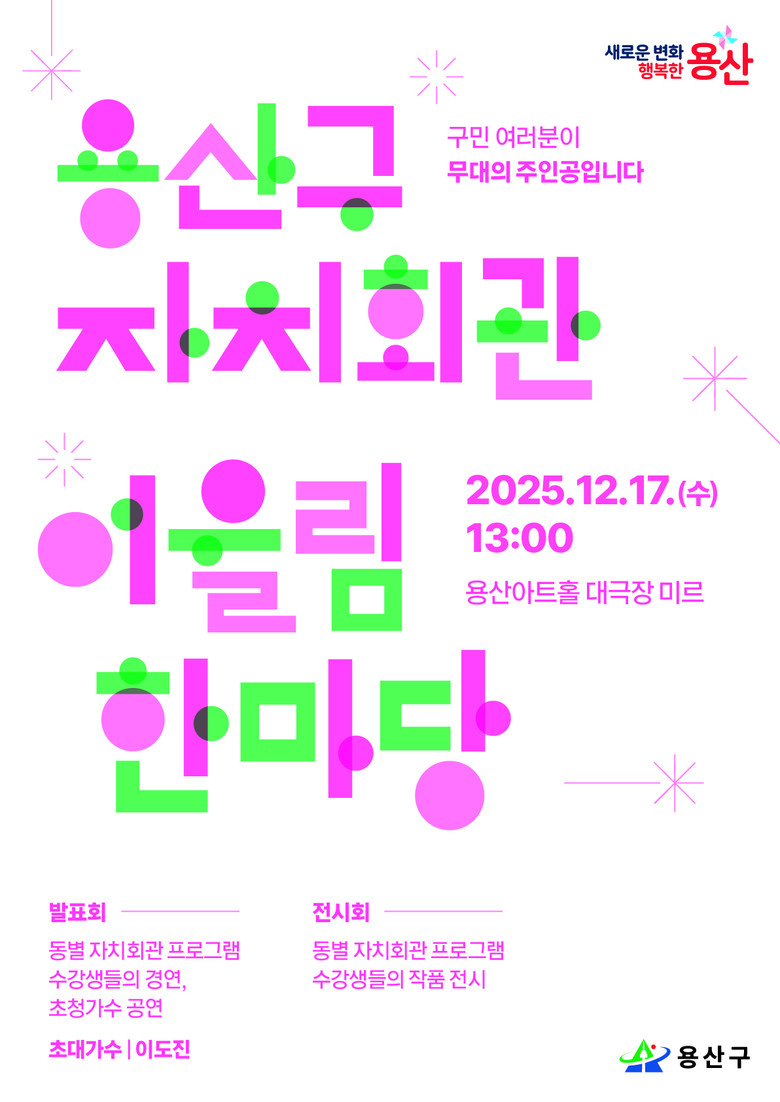 행사는 자치회관 프로그램 발표회와 작품 전시, 축하공연 등으로 구성되며, 용산구민과 자치회관 관계자 등 500여 명이 참석할 예정이다.
