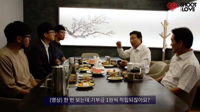 | ▲자생의료재단 신준식 명예이사장(오른쪽 두 번째), 박병모 이사장(오른쪽 첫 번째)이 슛포러브 제작진들과 후원과 관련한 대화를 나누고 있다. (사진출처=슛포러브 유튜브 캡처) |