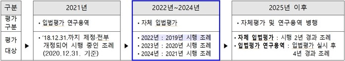 한편, 올해부터는 시행된 지 2년이 경과한 조례에 대하여 도의회사무처 입법정책담당관실과 집행부 소관부서를 중심으로 매년 자체평가를 실시하고, 2025년부터는 입법평가를 받은 지 4년이 경과된 조례에 대하여 전문기관 연구용역을 통해 전반적으로 재검증할 예정이다.