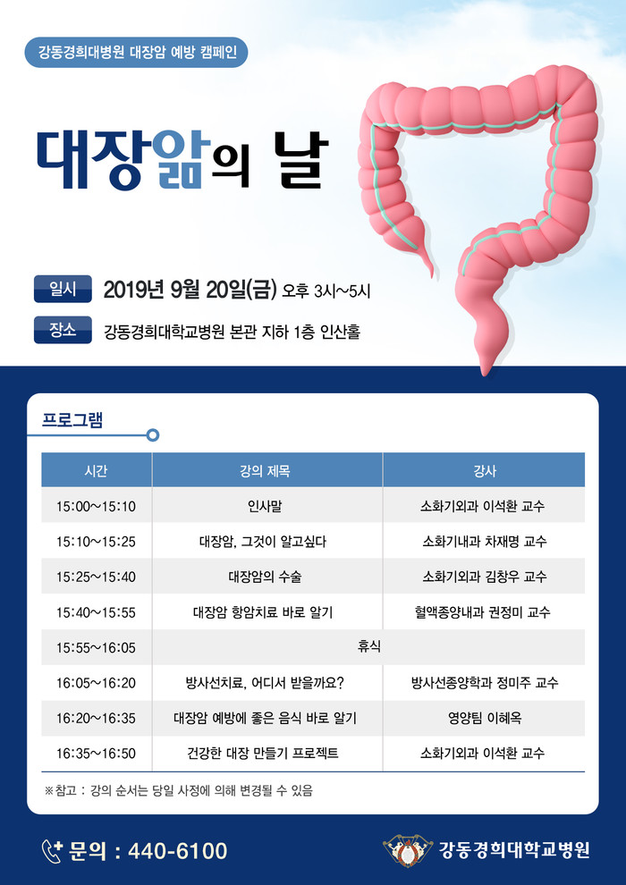 강동경희대학교병원(원장 김기택)은 오는 9월 20일(금), ‘대장앎의 날’을 주제로 건강강좌를 개최한다. 강좌는 오후 3시부터 본관 지하 1층 인산홀에서 진행된다.