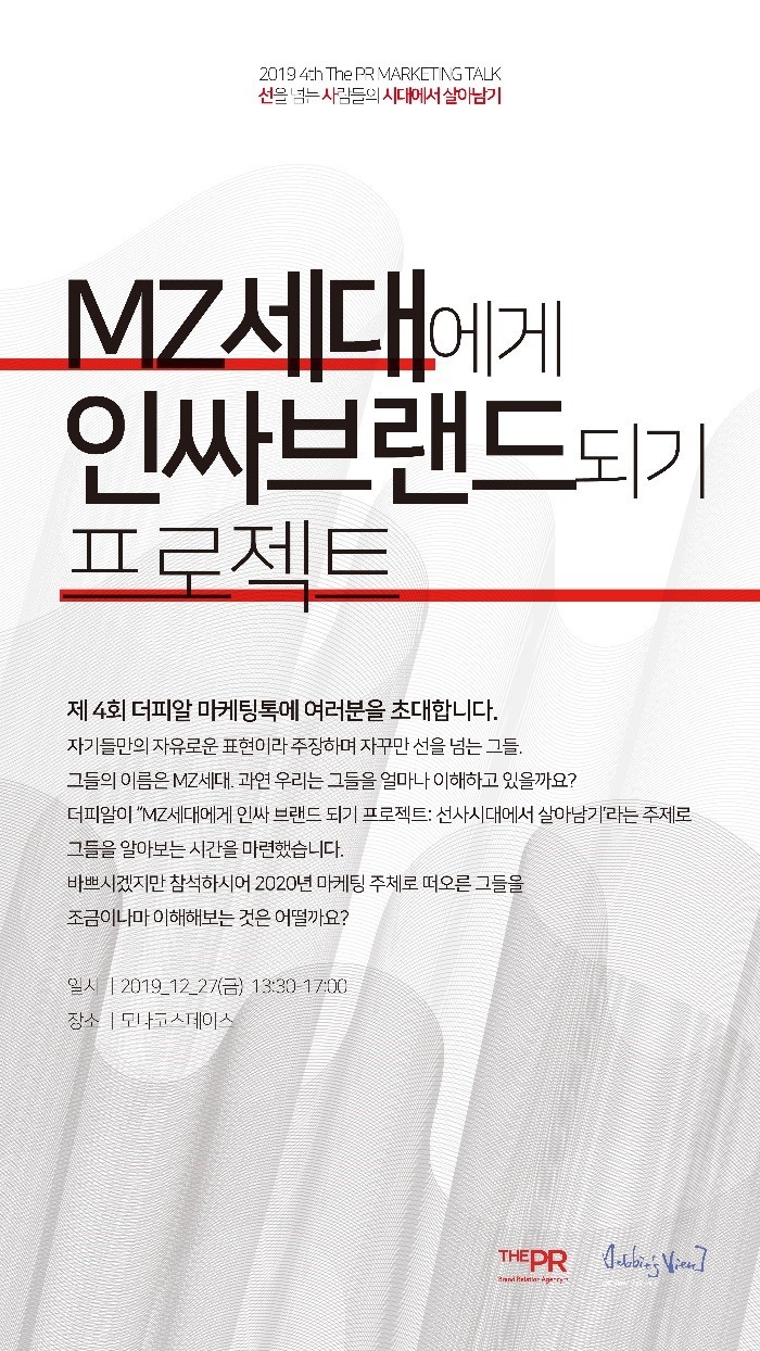 IMC 전문 홍보대행사 더피알(대표 김진희)이 청년마케팅 에이전시 데뷰월드와이드(대표 김수현)와 함께 오는 27일(금) 서울 소재 모나코스페이스에서 ‘제4회 마케팅톡: MZ세대에게 인싸브랜드 되기 프로젝트’를 개최한다.