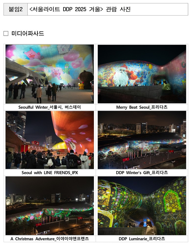 해치와 소울프렌즈, 라인프렌즈, 이야이야앤프렌즈 등 인기 캐릭터와 협업한 미디어파사드는 따뜻한 연말 정서를 더했고, ‘힙(HIP)산타’가 등장한 ‘Merry Beat Seoul’, ‘DDP Winter’s Gift’, ‘DDP Luminarie’는 DDP 전역을 하나의 크리스마스 타운으로 연결했다.