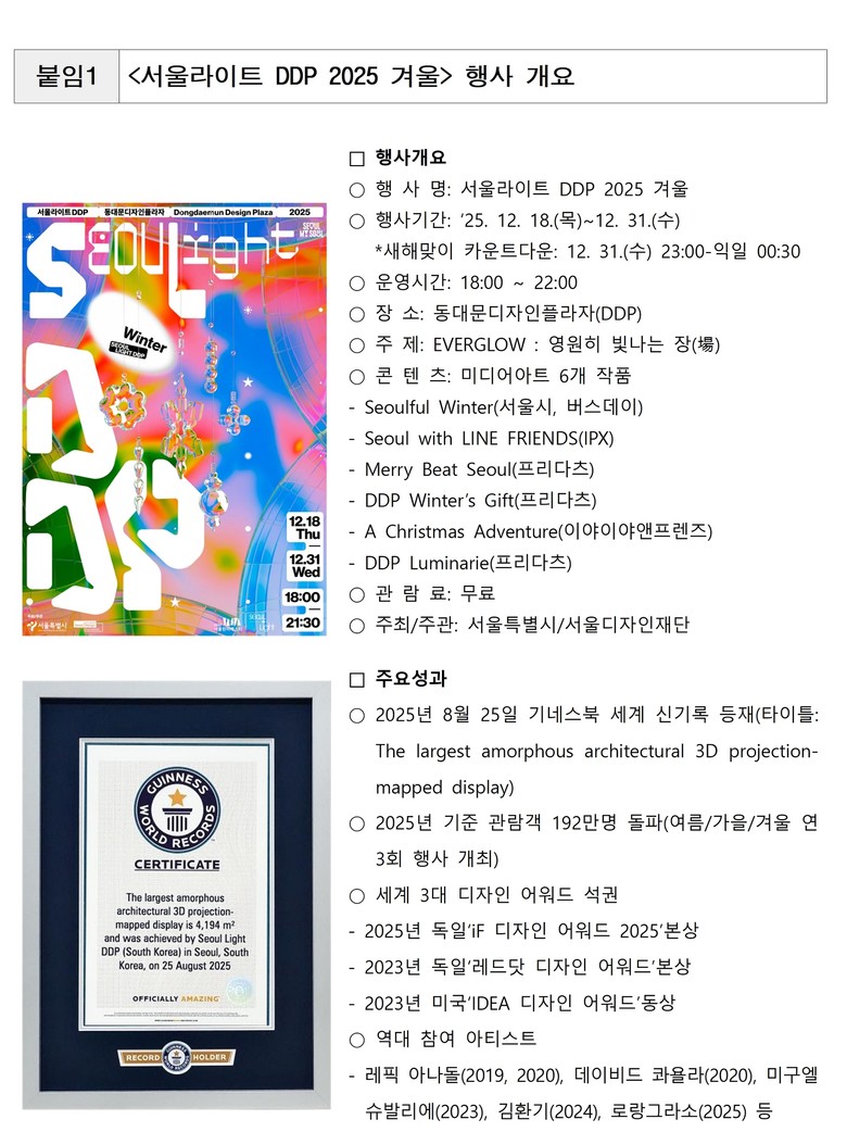 DDP 전 공간을 활용한 미디어파사드와 공간 연출은 연말의 서울을 따뜻하고 화려한 빛으로 물들이며 14일간 약 80만 명의 눈과 마음을 사로잡았다. 2025년 한 해 시민에게 감동을 전한 <서울라이트 DDP>는 전년 대비(138만 명) 약 40% 늘어난 192만 명의 방문객을 이끌며 역대 최대 규모를 기록했다.
