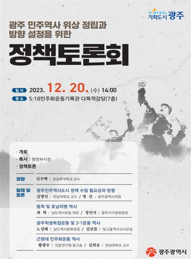 주제 발제와 토론은 ▲김병인 전남대학교 교수·명진 광주광역시의원의 ‘광주민주역사도시 정책수립 필요성과 방향’ ▲최혁 남도역사포럼 대표·정인서 광주서구문화원장의 ‘동학 및 호남의병 역사’ ▲노성태 남도역사문화원장·김보름 빛고을역사교사모임 대표의 ‘광주학생독립운동 및 3·1운동 역사’ ▲황광우 5‧18민주화운동 작가·김희송 전남대학교 교수의 ‘광주학생독립운동 및 3.1운동 역사’ 등이 진행된다.