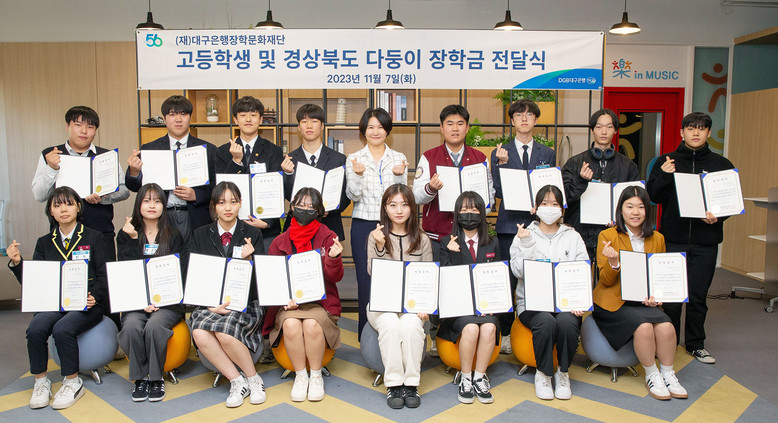 ‘고등학생 장학금’은 미래 인재를 육성하고 학생들의 학업을 장려하기 위해 매년 실시하고 있는 (재)대구은행장학문화재단의 대표적인 장학 사업이며, ‘경상북도 다둥이 장학금’은 저출산 및 인구감소 문제를 극복하고자 2019년 경상북도와 체결한 ‘다둥이 가정 우대 문화 조성 협약’에 따라 후원하고 있는 장학금 지원 사업이다.