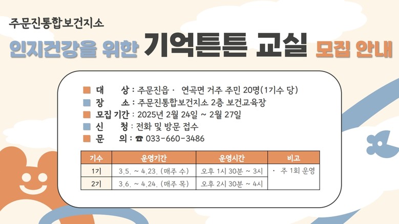 1회기 수업은 3월 5일부터 4월 23일까지 매주 수요일 오후 1시 30분부터 3시까지 진행되며, 신청은 2월 24일(월)부터 2월 27일(금)까지 주문진통합보건지소를 방문하거나 전화(☎033-660-3486)로 접수 가능하다.