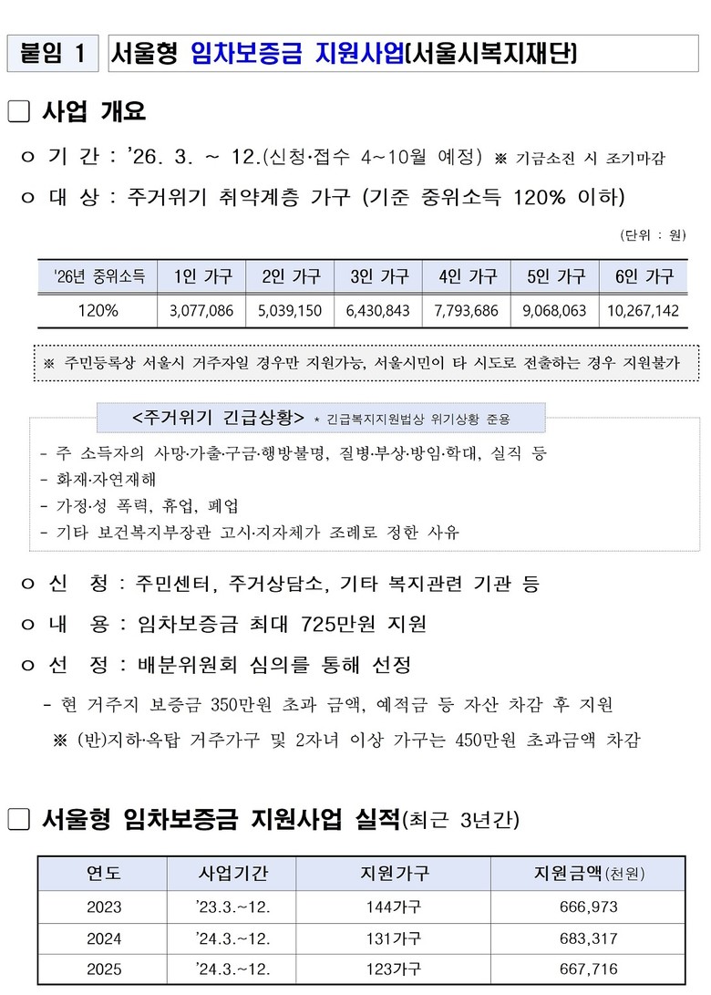 ‘서울형 임차보증 지원사업’과 ‘취약계층 위기가구 지원사업’은 서울시에 거주하는 기준중위소득 120% 이하 가구 중 주소득자의 사망이나 재해, 범죄피해, 중한 질병, 실직 등으로 긴급한 위기에 처한 복지사각지대 취약계층을 돕는다.
