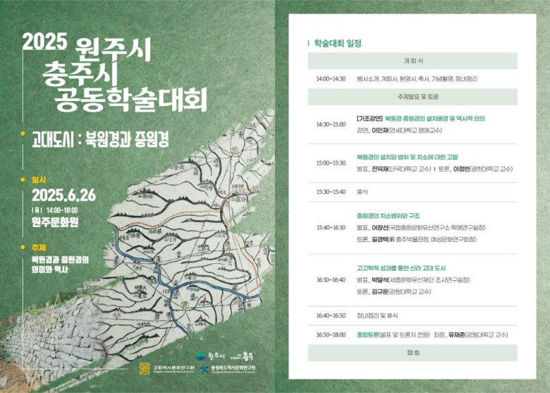 대회는 이인재 연세대학교 명예교수의 기조강연 「북원경·중원경의 설치 배경 및 역사적 의의」를 시작으로, 주제 발표와 종합토론 순으로 진행된다.