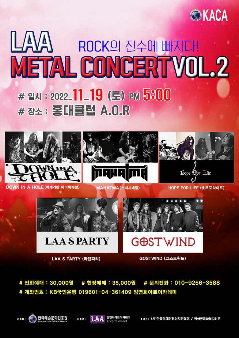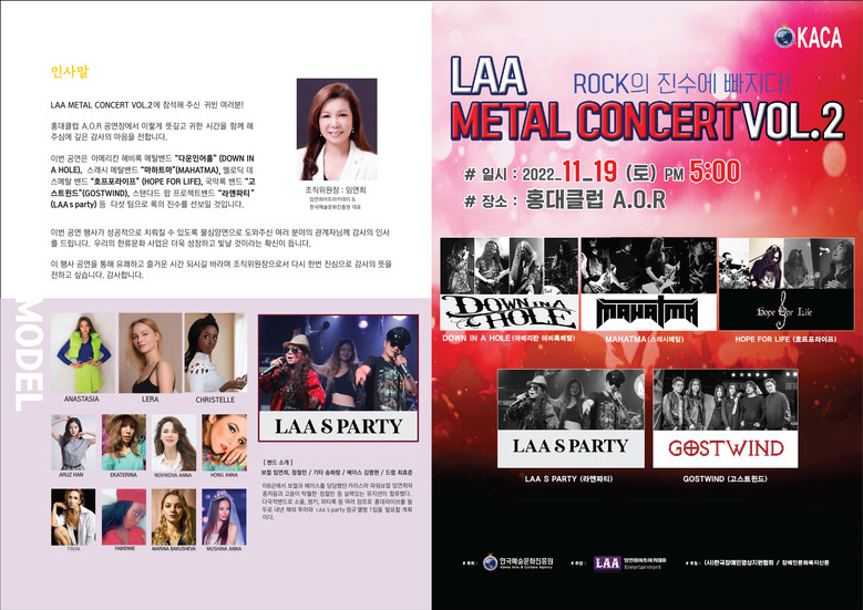 [세계타임즈 백진욱 기자] 이번 11,19(토) 오후5시 홍대AOR클럽에서 LAA‘METAL CONCERT V0L. 2’ROCK 페스티벌 공연이 개최된다.