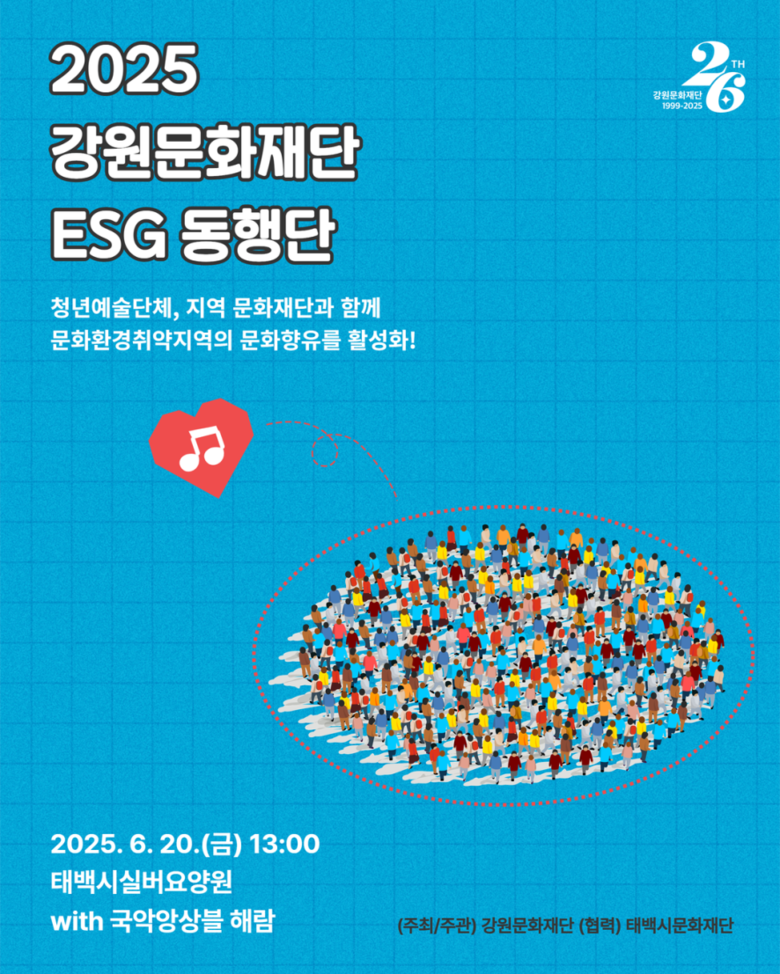 ・6월 20일 태백시문화재단과 < ESG 동행단 > 선정단체 ‘국악앙상블 해람’과 협력 운영 [강원도 세계타임즈=김민석 기자] 강원문화재단(대표이사 신현상)은 도내 문화환경 취약지역을 대상으로 추진하는 문화예술 사회공헌활동인 < ESG 동행단 >을 오는 6월 20일 태백시에서 시작한다고 밝혔다.