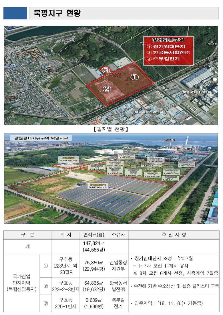심영섭 강원경제자유구역청장은 “북평 지구는 수소 중심 기업 유치를 통해 연내 전 필지 분양·임대 완료가 예상된다”며, “향후 국가 수소 산업 정책과 연계해 신성장의 거점으로 육성되고 고용 창출 및 지역 경제 활성화에 크게 기여할 것”이라고 밝혔다.