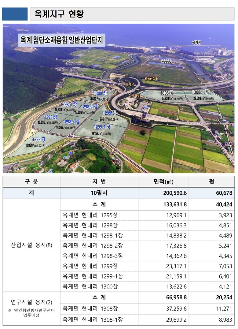 또한 ”옥계지구는 차별화된 분양·임대 전략과 함께 연안항만방재연구센터의 유치를 조속히 추진해 미래 첨단산업의 중심지로 발전할 수 있도록 노력하겠다.“라고 덧붙였다.